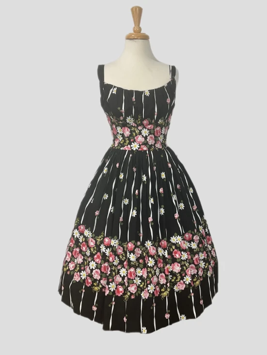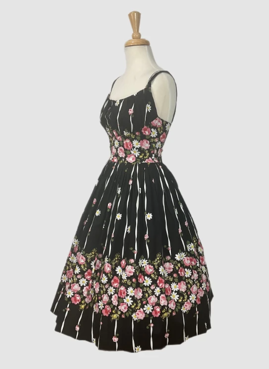 Oh so pretty! This Vintage inspired dress has a black background, with beautiful pink rose posies. It has a gathered bust, front waist yoke and comfortable straps. There is tucking on the skirt that allows for a beautiful fullness. It also has pockets