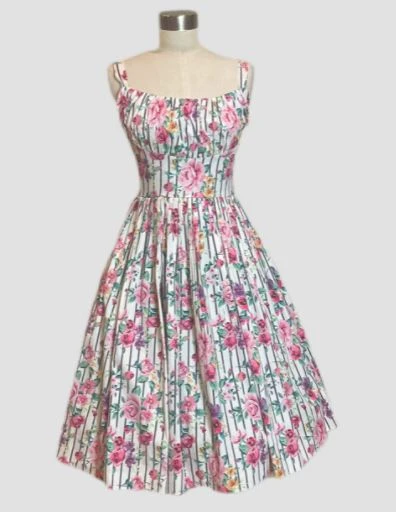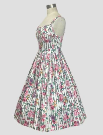 Oh so pretty! This Vintage inspired dress has a white background, with beautiful rose and lilac florals. It has a gathered bust, front waist yoke and comfortable straps. There is tucking on the skirt that allows for a beautiful fullness. It also has pockets